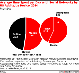 2014 was the year where social networking finally became more popular on mobile devices than on desktop computers. The chart below from eMarketer shows the average time spent per day with social networks by U.S. adults. Mobile social networking beat out desktop (online) 35 minutes to 33.