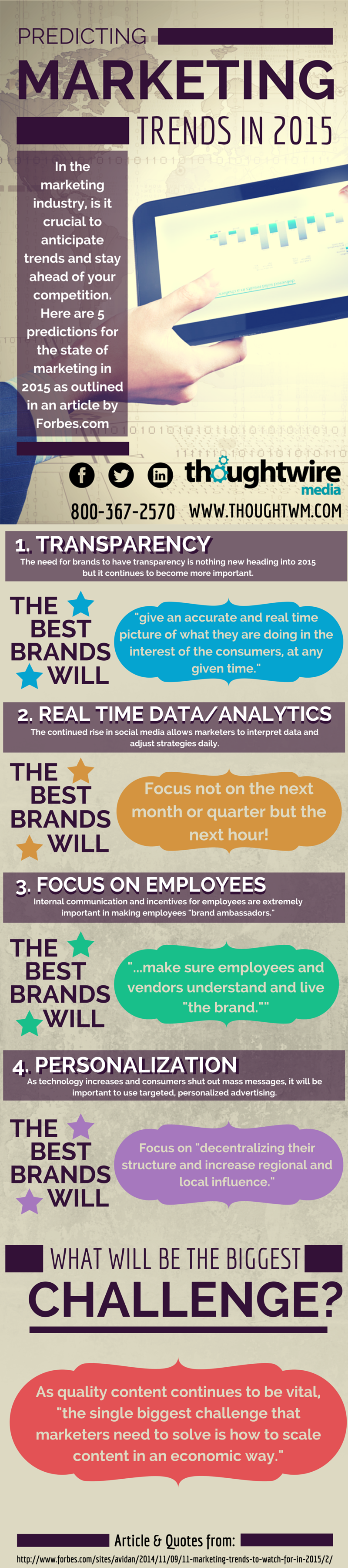 Here, we took an article from Forbes.compicked out some of our favorite points and turned it into an easy-to-understand infographic. The topic? Marketing trends to watch for in 2015!